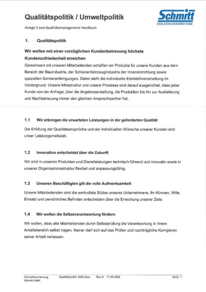 Eine nachhaltige Produktion auf einer maximalen ökologischer Grundlage ist bei der Edelstahlverarbeitung Schmitt seit Firmengründung des Familienbetriebes Basis der unternehmerischen Verantwortung für Region, Mitarbeiter und Gesellschaft.